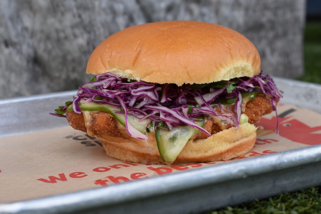 Panko breaded cutlet, umami aioli, purple cabbage slaw, namasu pickles, soft potato bun