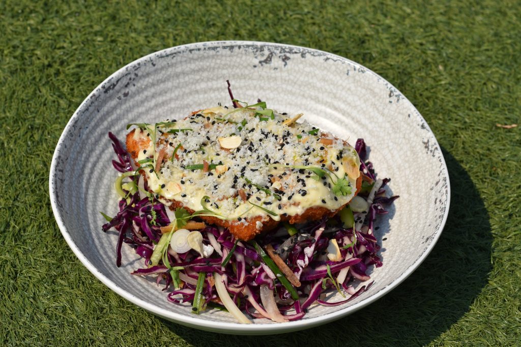 Katsu cutlet, yuzu kosho kewpie, mac nut snow, purple cabbage-asian pear-radish salad, crispy ginger & garlic, sesame seeds, sweet soy lime vin