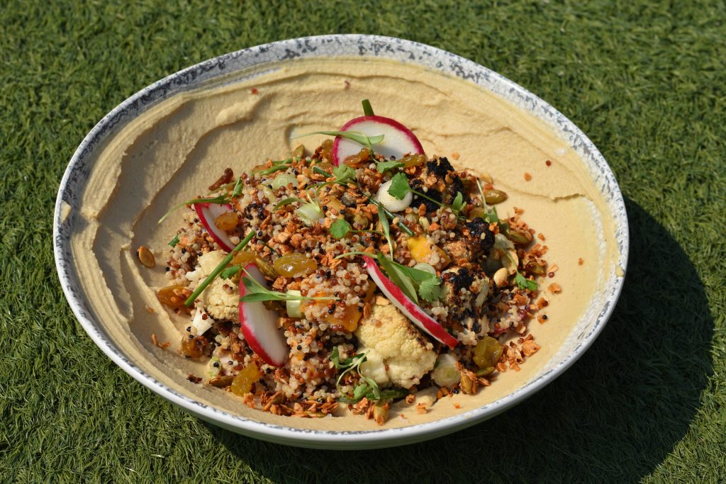 Roasted squash, charred cauliflower, pumpkin seed granola, pickled golden raisins, garlicky lime crema, creamy hummus, quinoa